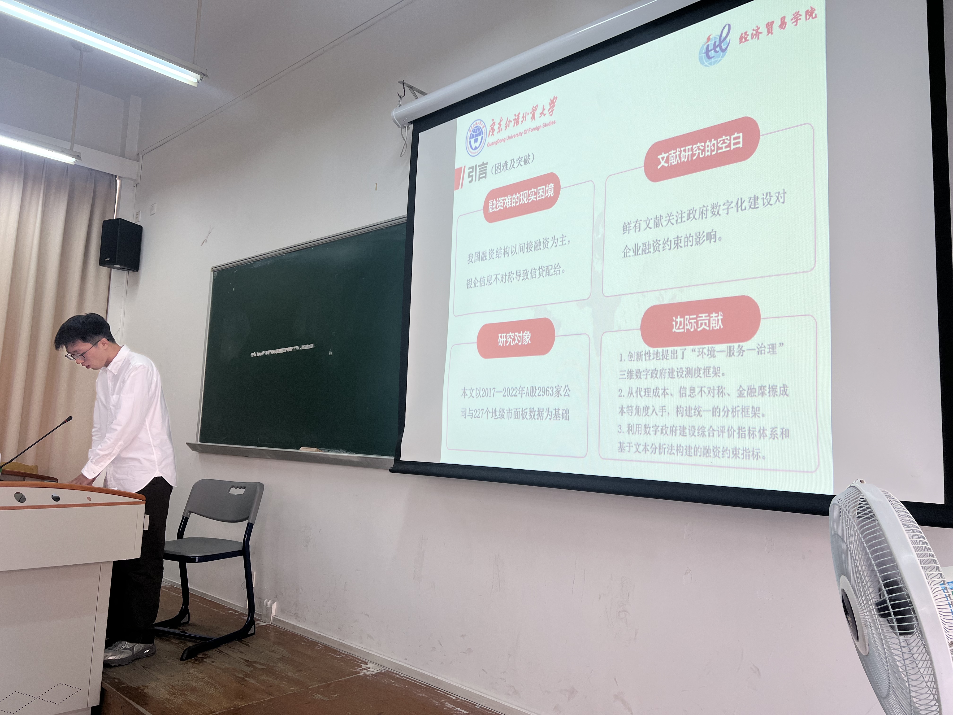 2025年10月16日下午14点30分,经贸学院2025年第9期(总期第97期)国贸理经学术论坛在教学楼B座308室顺利举行。本次论坛由经贸学院董洁妙老师主持,硕士研究生周元瑞同学聚焦当前经济热点,汇报了发表于《经济研究》的重磅论文《数字政府建设与企业融资约束》。该议题紧扣国家发展战略与市场主体关切,吸引了学院各级研究生同学积极参与本次深度学术研讨活动。
