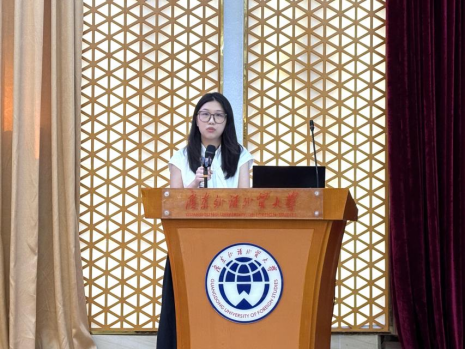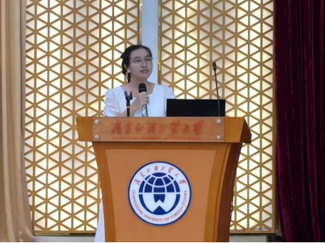 接着,博士研究生周燕萍作为在校研究生代表上台发言,她向大家分享求学经历和学习心得,讲述自己的求学经历,提醒新生需要关注自己的身体健康。并且勉励新生敢于挑战,积极适应大学生活。国际商务研究生新生代表杨竣同也上台向大家表达了初来广外的激动心情,期待未来能在广外刻苦学习,他呼吁同学们未来积极探索学习并由衷祝愿甲子广外再续辉煌。